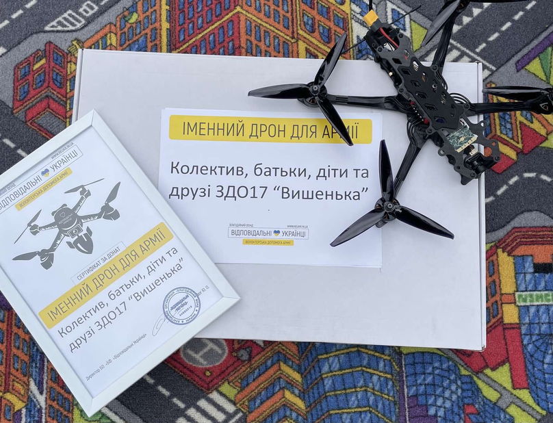 Особливою несподіванкою став візит представників БФ «Відповідальні українці» Максима Кудрявцева та Тамари Салімової, які завітали, щоб привітати малят та прийняти дрон придбаний за кошти батьків, колективу і друзів ЗДО№17 «Вишенька», який буде відправлений для 3-го загону швидкого реагування прикордонної комендатури (Харківський напрямок). На згадку про цей незабутній день всі разом зробили велике, дружнє фото – символ нашої єдності та віри у щасливе майбутнє! Разом до перемоги!
