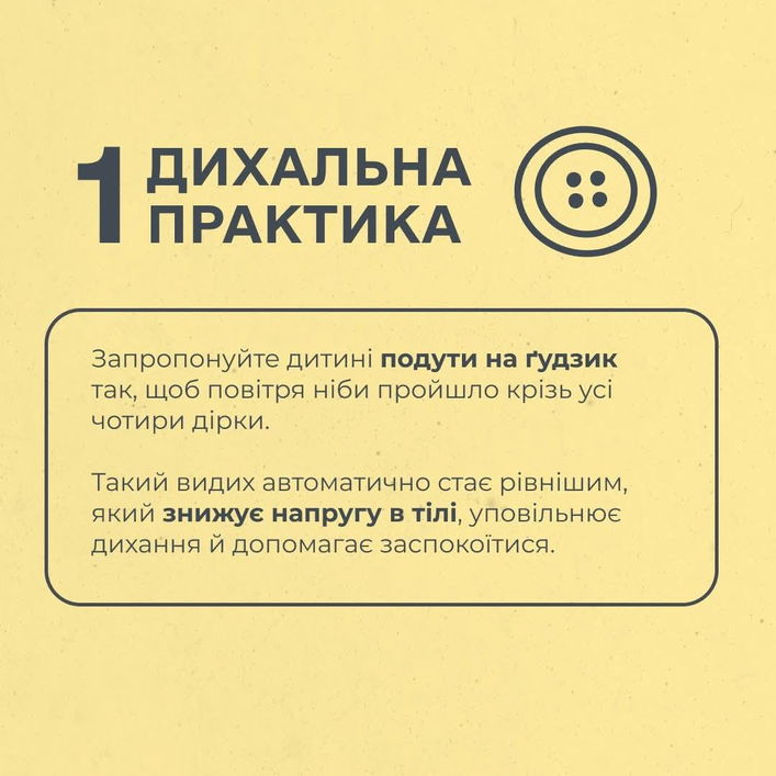 - Покрутити ґудзик на бортику, як дзиґу, рахувати секунди, скільки він крутиться і не падає. Поки ґудзик крутиться - намагатися затримати подих. Практика уважності, дихання і фокусування на поточному моменті.