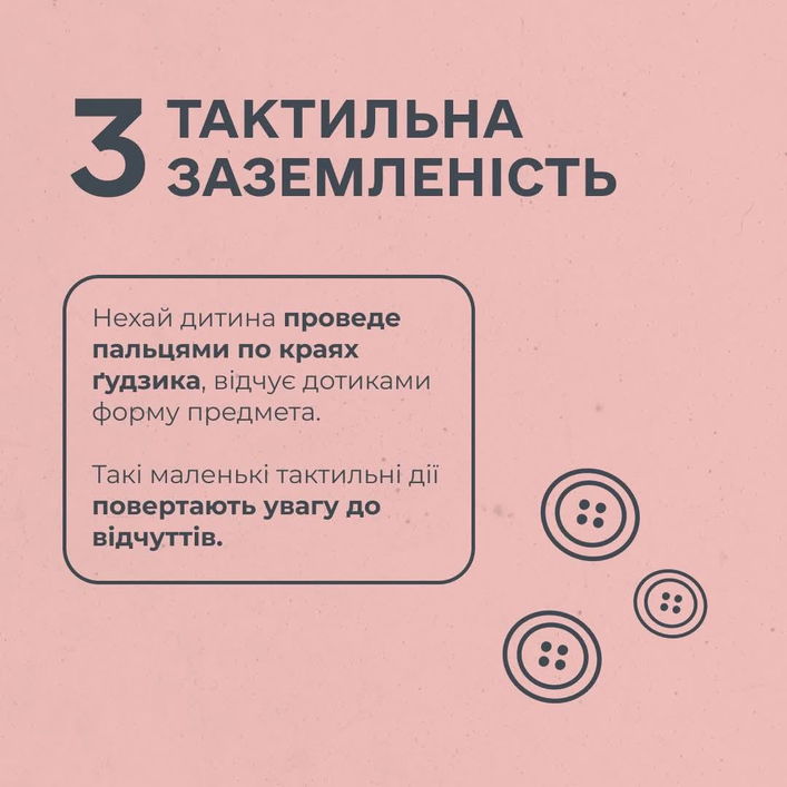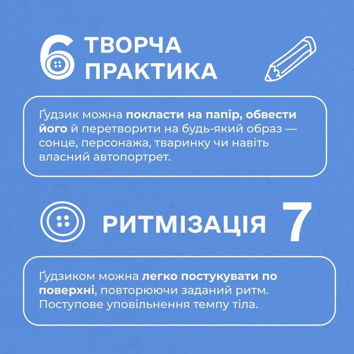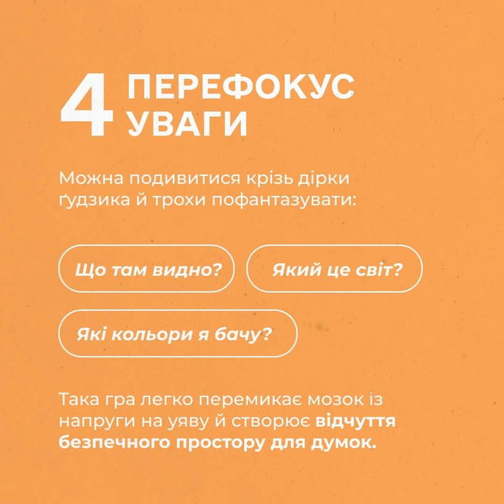 - Дивитися крізь дірочки: якби цей ґудзик був чарівним - що крізь нього видно? Практика для перефокусування, залучає увагу й уяву.