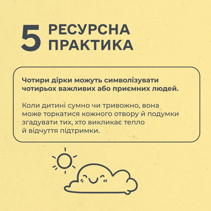 - Чотири дірочки символізують чотирьох важливих людей, про яких згадувати приємно. Коли дитина сумує, може торкнутися цих отворів. Ресурсна практика, додає відчуття підтримки.