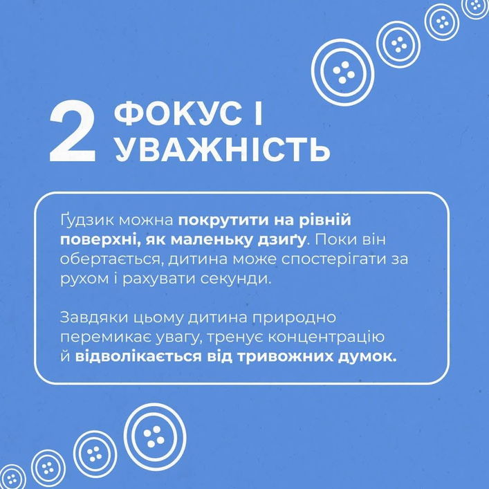 - Покрутити ґудзик на бортику, як дзиґу, рахувати секунди, скільки він крутиться і не падає. Поки ґудзик крутиться - намагатися затримати подих. Практика уважності, дихання і фокусування на поточному моменті.