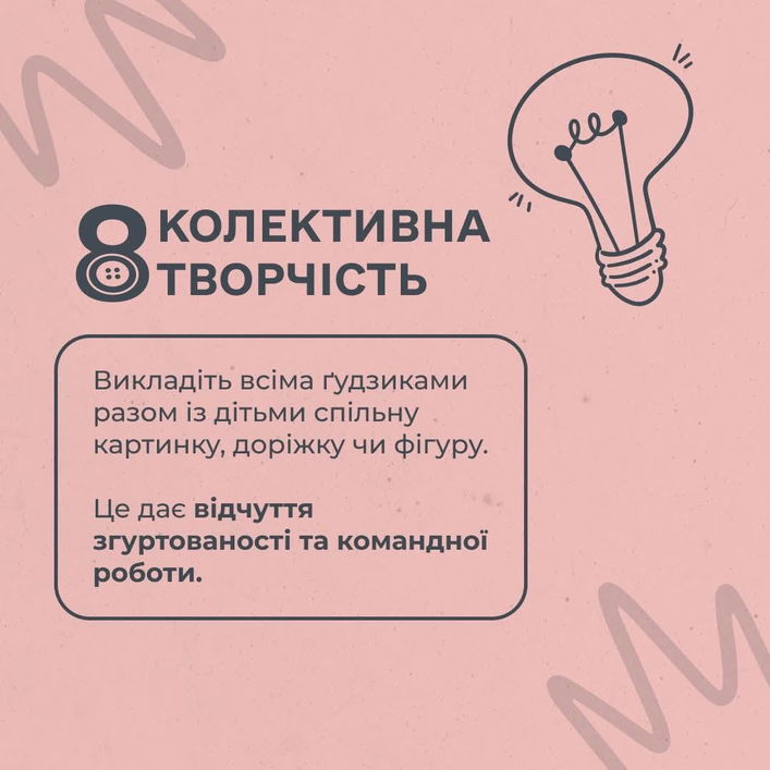 - Викласти всіма ґудзиками разом із дітьми спільну картинку, доріжку чи фігуру -це дає відчуття згуртованості.
