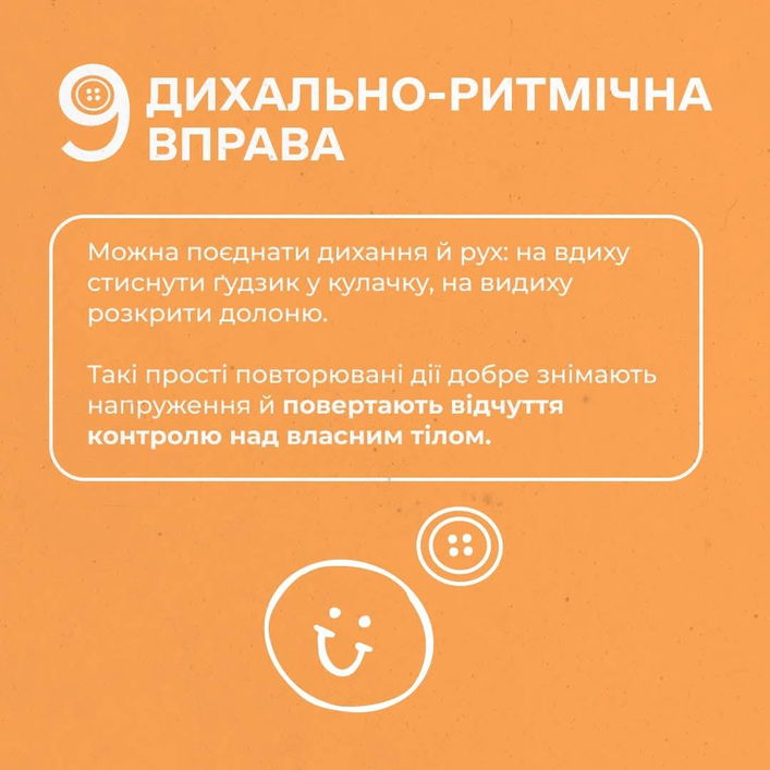 - Вдих - промовляємо: «ґудзик стисну в кулачку», видих - «відкриваю сонечку». Ритмічна дія, що знімає тілесне напруження, дихальна вправа.